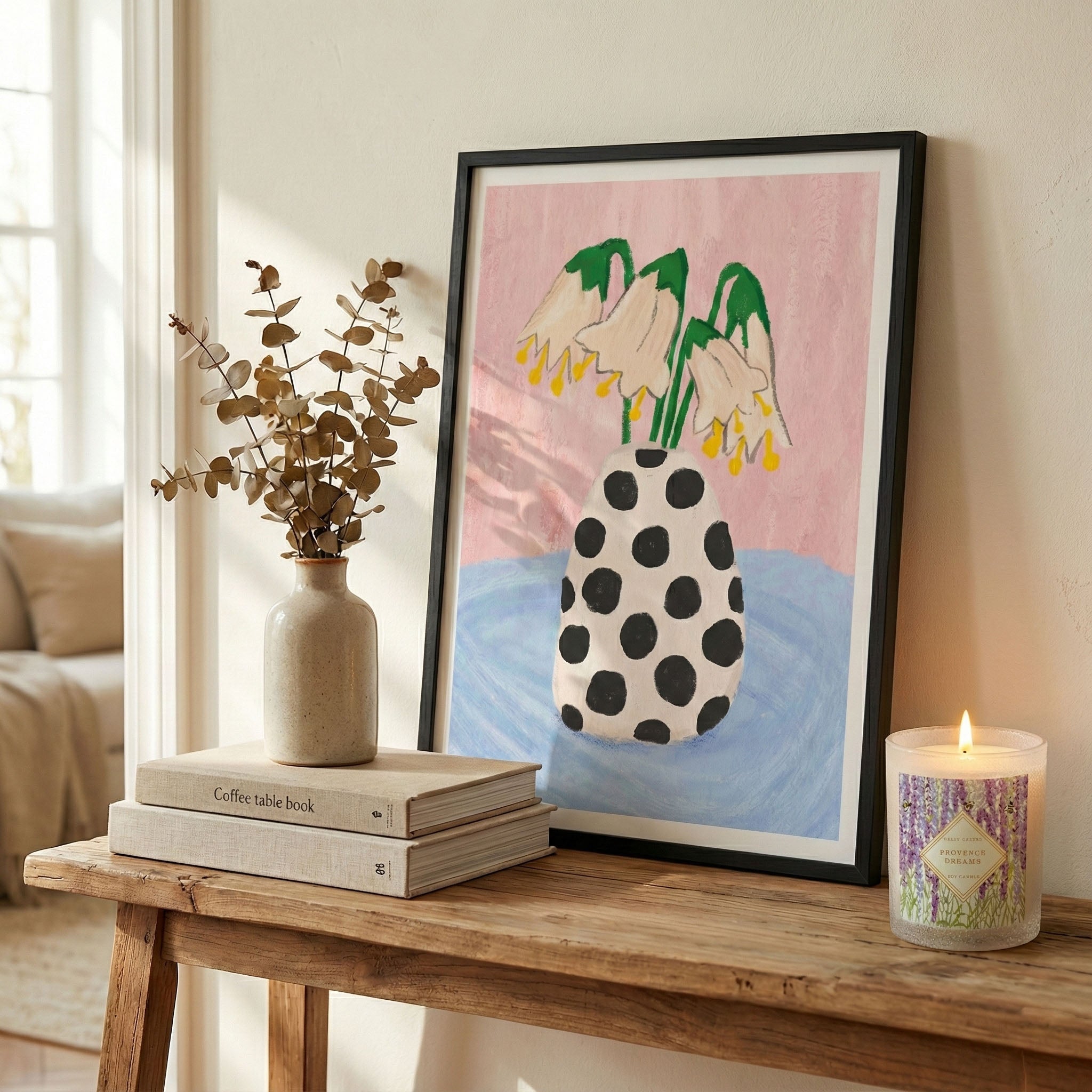 Die Tupfen auf der Vase verleihen eine verspielte Note und deuten auf die verborgene Lebendigkeit unter der eleganten Außenseite hin. Die weißen Blumen selbst bleiben der Fantasie überlassen, sodass der Betrachter die Szene mit seinen Lieblingsblumen personalisieren kann – vielleicht mit zarten Pfingstrosen, duftenden Lilien oder klassischen Rosen.