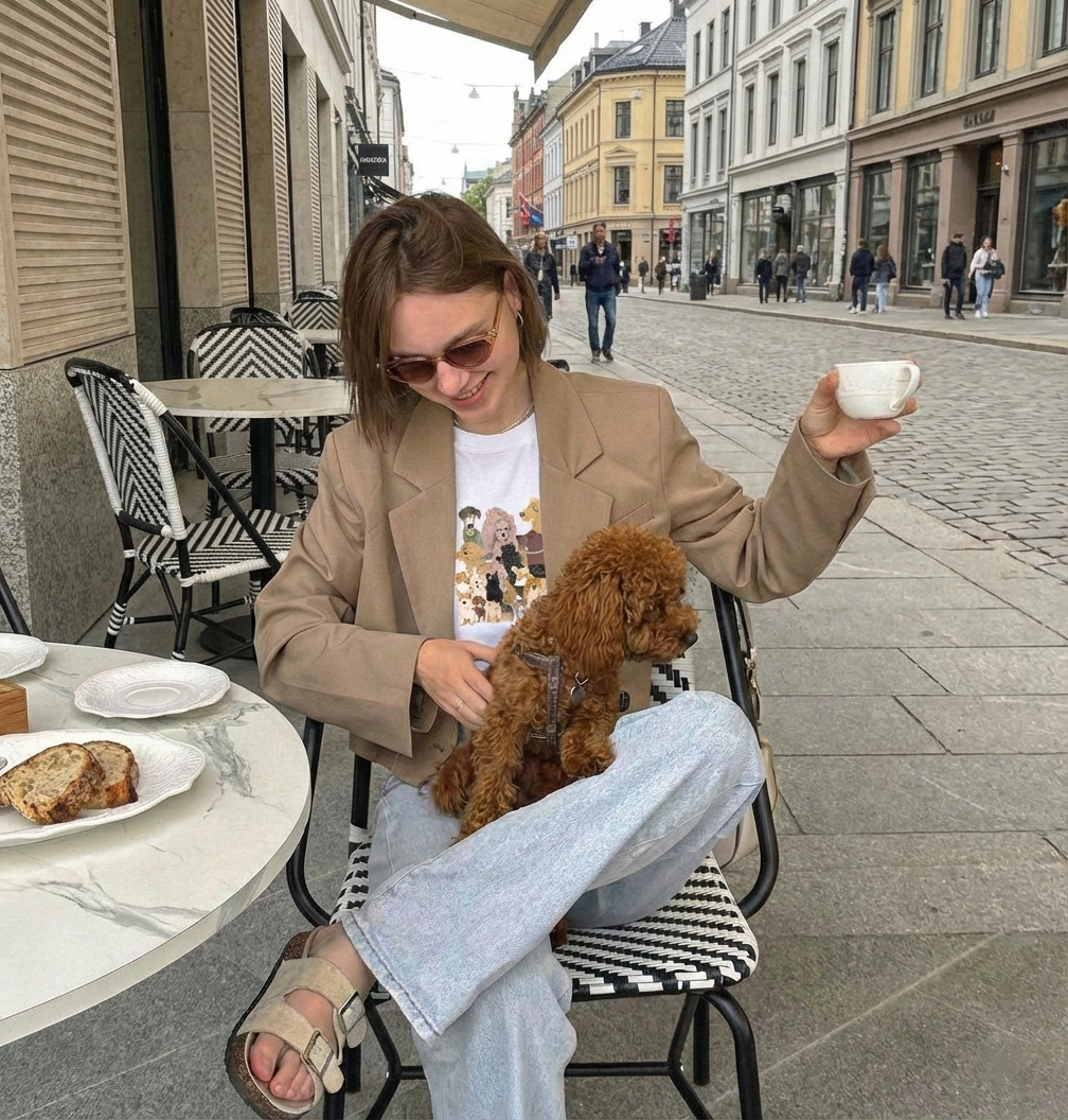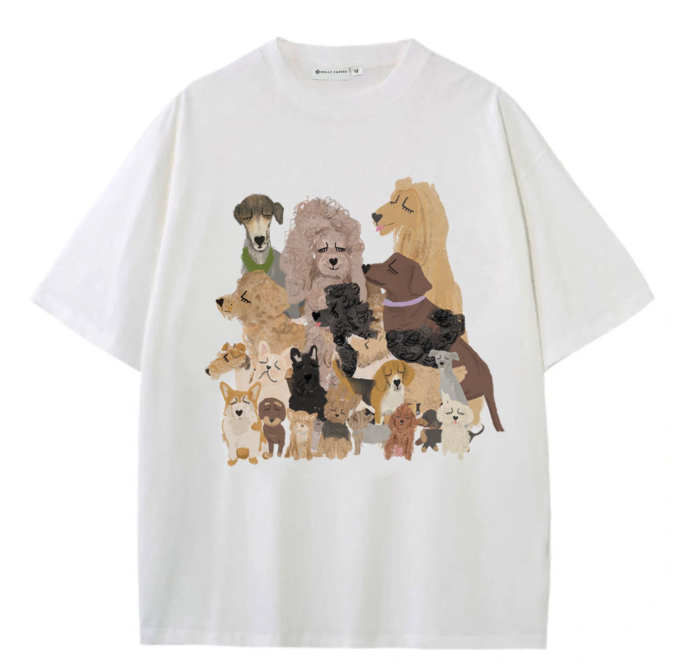 Das ist nicht einfach nur ein T-Shirt, sondern ein stylisches Statement. Die Vorderseite ziert eine charmante Hundeillustration, die den schicken und verspielten Stil von Nelly Castro perfekt einfängt. Doch das Design hört hier nicht auf: Auf der Rückseite prangt der handgeschriebene Schriftzug „Dog Lovers Club“ – damit bist du offizieller Botschafter des besten Hundeclubs der Welt.