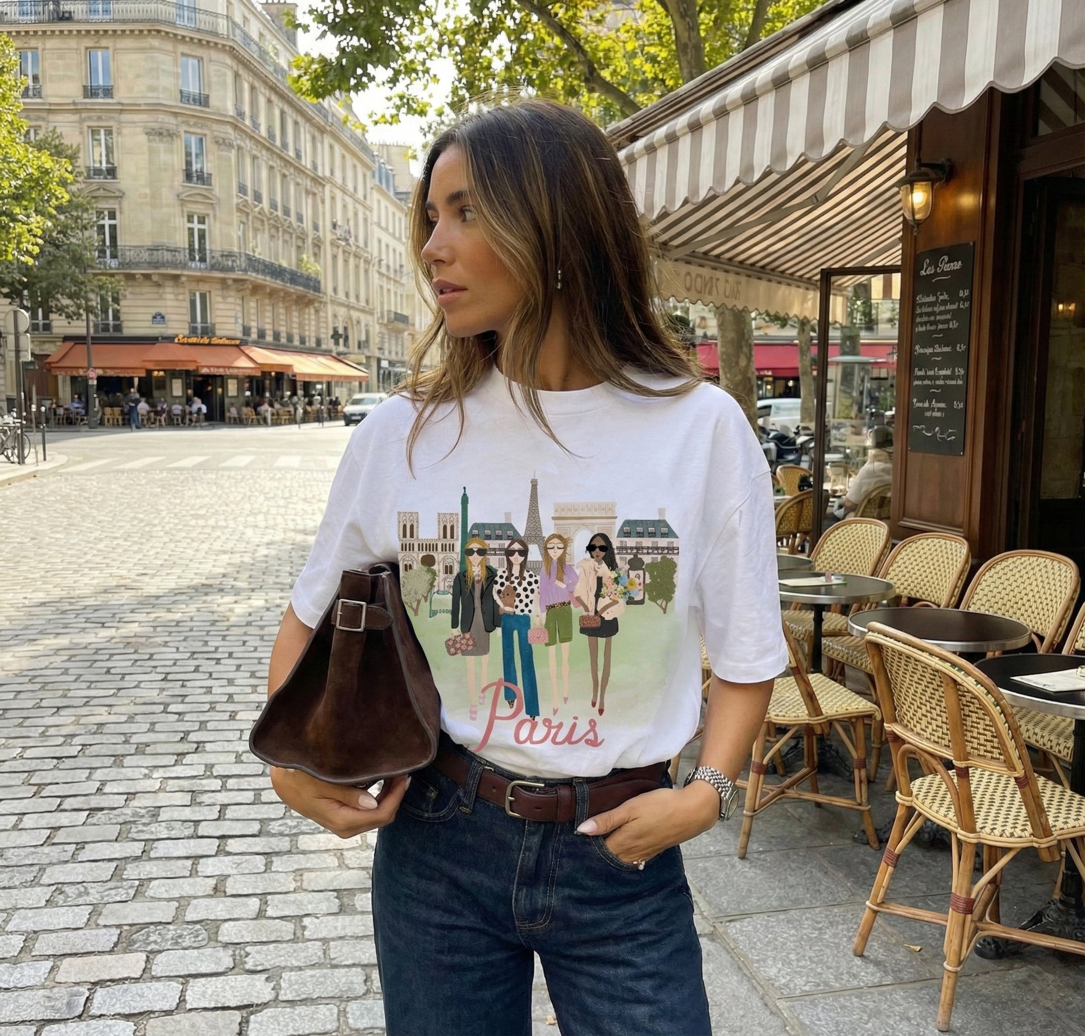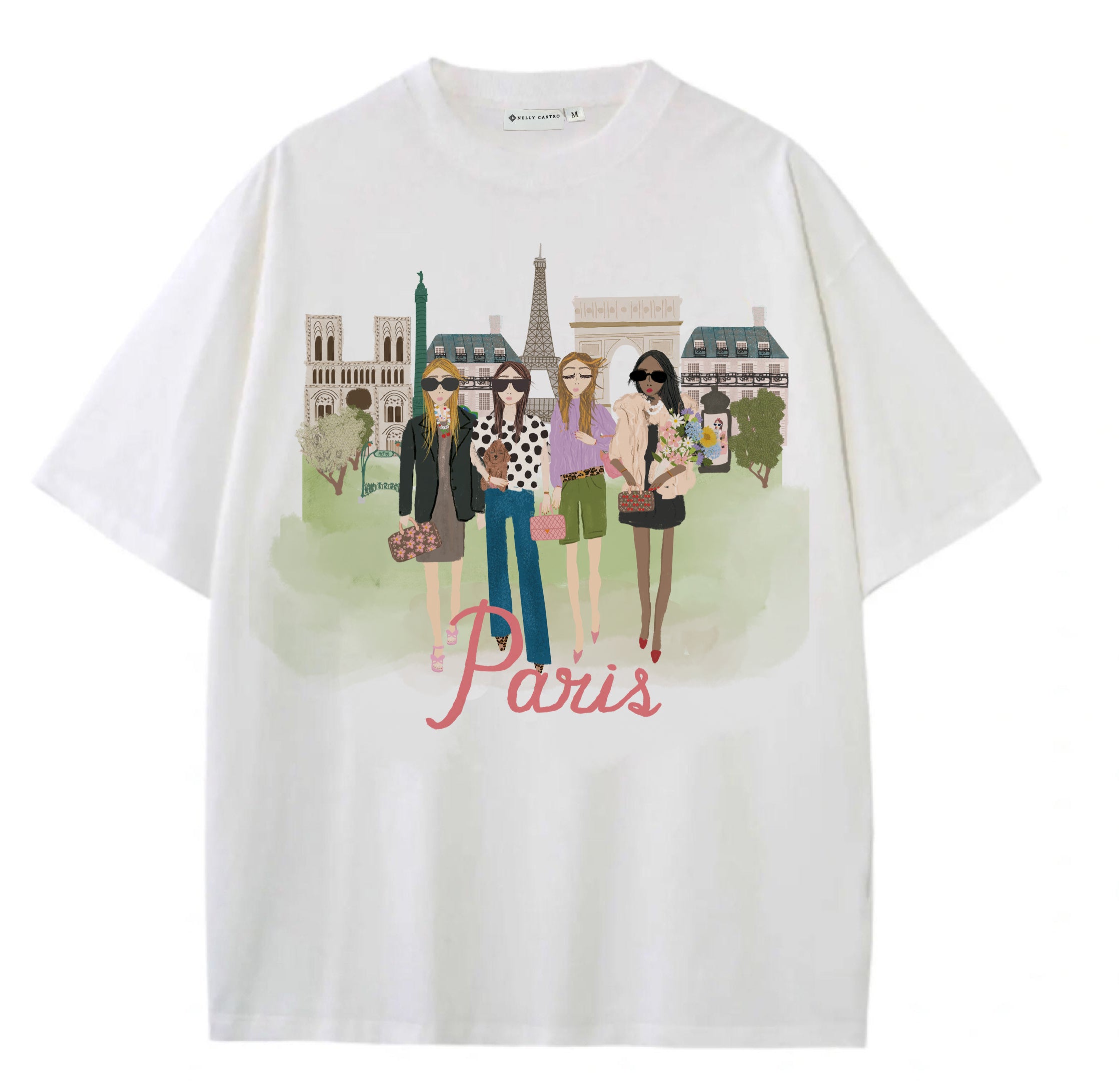 „Girls in Paris“ ist ein illustriertes T-Shirt, das Mode und die berühmten Pariser Wahrzeichen feiert. Es zeigt stilvolle Frauen vor dem Eiffelturm, Notre-Dame und dem Arc de Triomphe. Das kunstvolle und elegante Design ist auf strahlend weißer Baumwolle gedruckt und perfekt für alle, die Illustrationen, Stil und den Charme von Paris lieben.